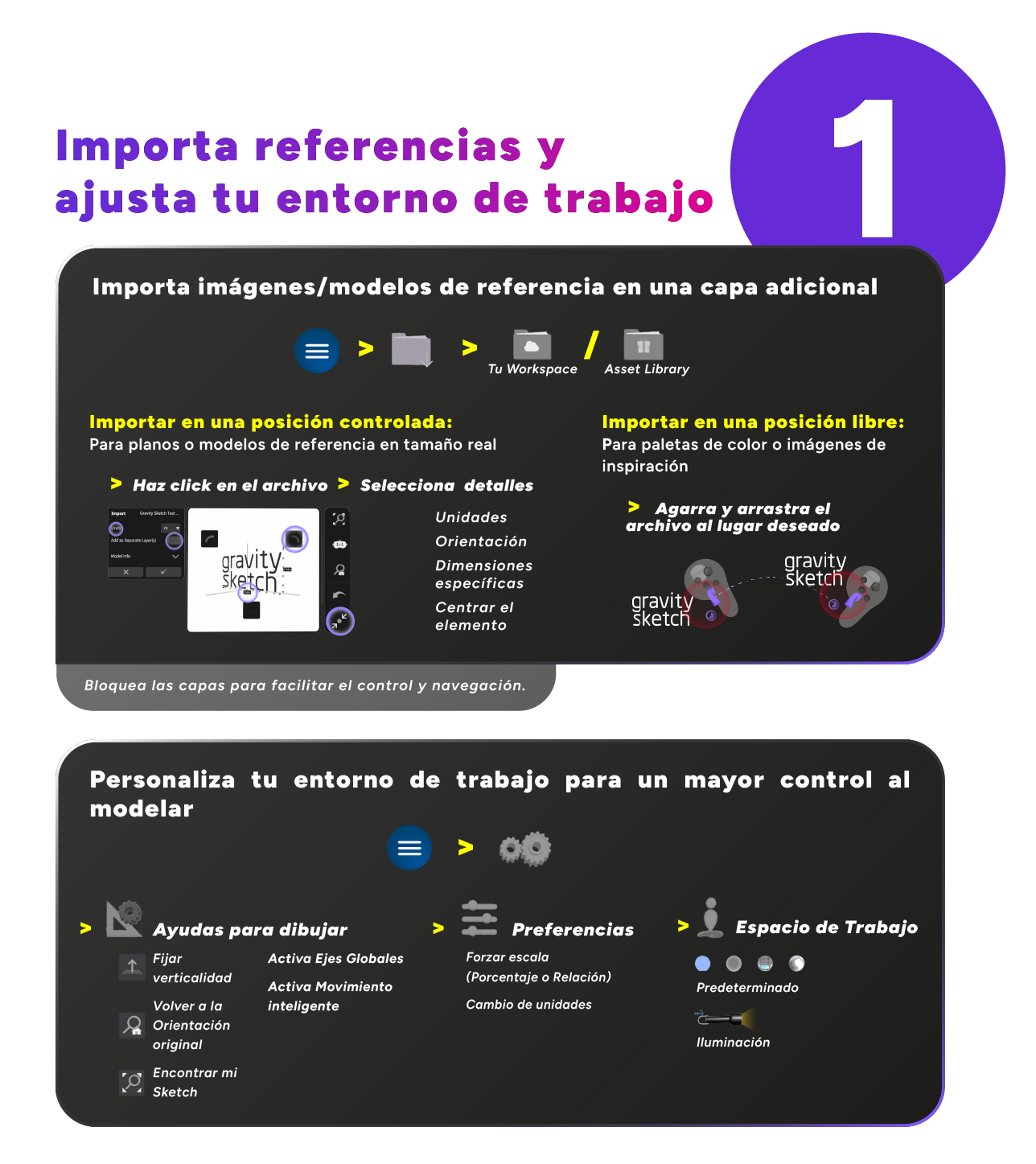 - Importa recursos: Importa el protocolo de verificaciones VIMO y los recursos de trabajo necesarios (imágenes y/o modelos de referencia) a tu cuenta de LandingPad antes de comenzar su sesión en Gravity Sketch.